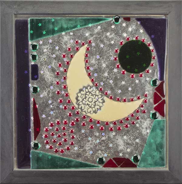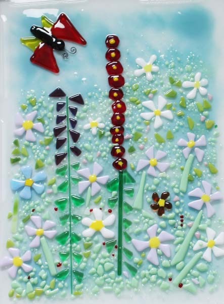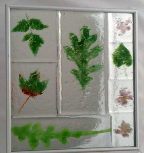 - Garden of My Dreams, fused glass in a white frame, 16,25 in high x 12 in wide ($200)