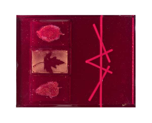 - Red, fused glass, including leaves; professionally framed by Studio S’Evans (Photo by Doug Baldwin)