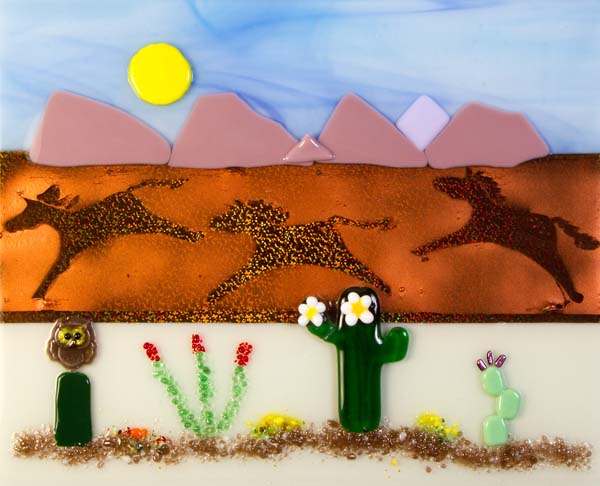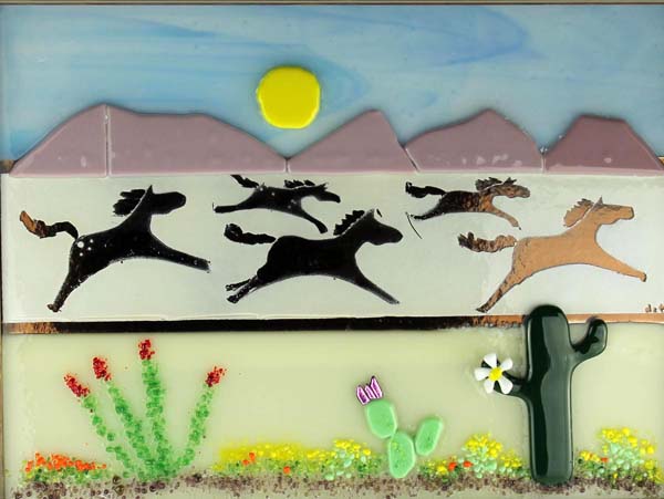 Here are some fused glass “pictures” that are framed and ready to hang (with wire). They are mounted over thin mirror or shiny holographic paper that has a design in it. This gives the piece extra interest and depth. Scroll down to see them all….Interested in purchasing one? Contact me for price and shipping info: dianectaylor@netscape.net or cell: (520) 624-7086 (be sure to leave a message so I know it’s not a spam call).
