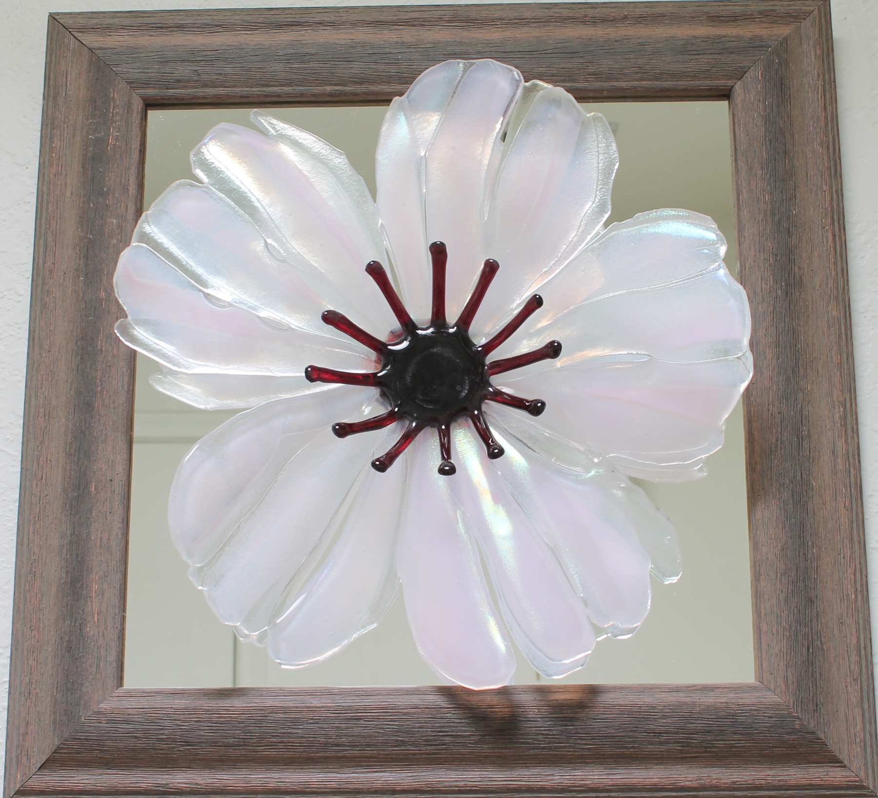 - Desert Hibiscus, iridized glass flower mounted on mirror and framed, about 16.5 inches square, 4 inches deep ($350)