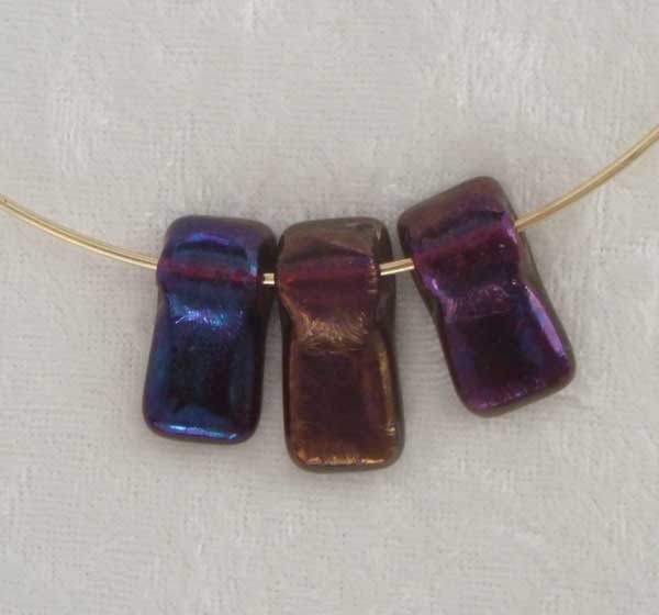 - Purple ripple dichroic pendant with beads, $40; earrings with 14-carat gold-filled wires, $30.