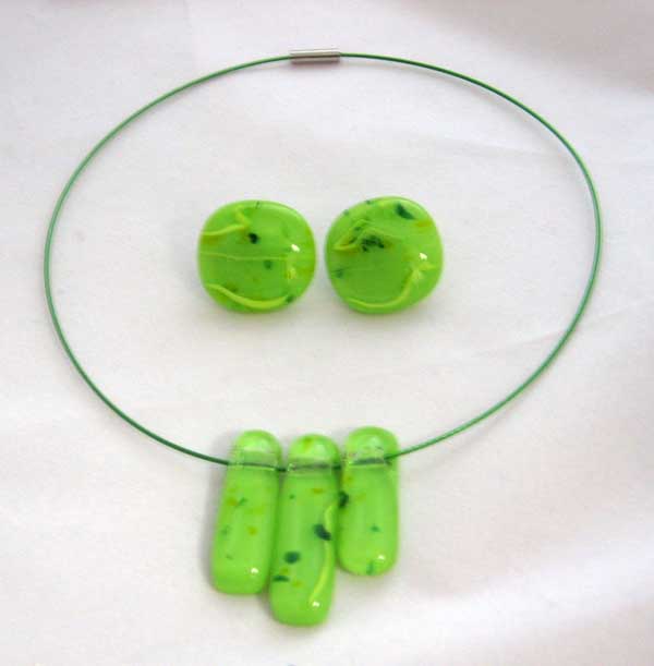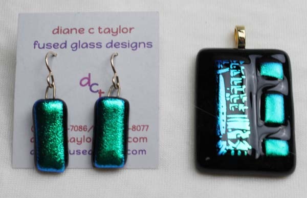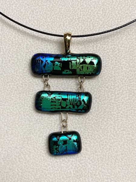 - Green Patterns, 3-piece dichroic pendant on 16″ or 18″ magnetic neck wire, $50. Matching earrings on 14-carat gold-filled wires, $30.
