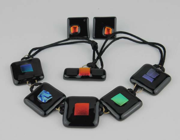 - 5-pc necklace, black glass with multiple colors of dichroic glass, $80; matching earrings $25.