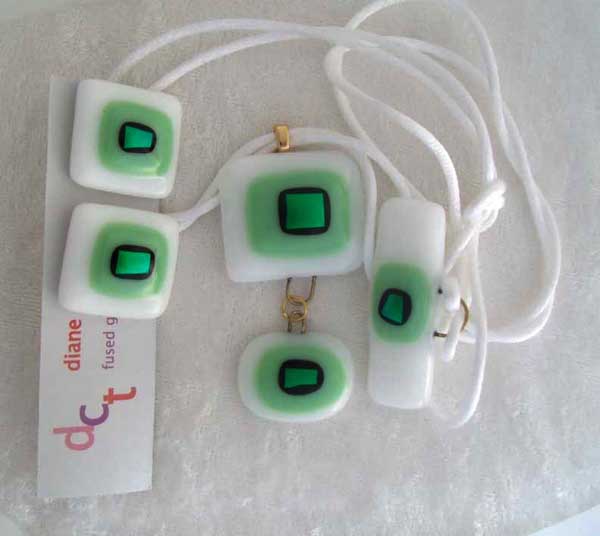 - 2-piece pendant, white with light green with green dichroic center, matching fob, $30. Matching earrings, $20.