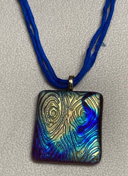 - Eyes, dichroic pendant on silk cord with matching fob, $50. Matching earrings on 14-carat gold-filled wire, $30.