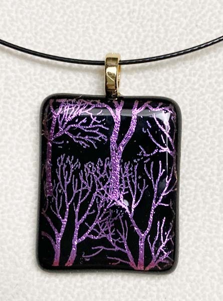 - Purple Forest, pendant with dichroic trees on magnetic 16″ or 18″ neck wire, $50