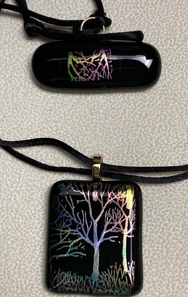 - Rainbow Forest, pendant with dichroic tree on cord with matching fob, $50. Matching earrings on 14-carat gold-filled wires, $30