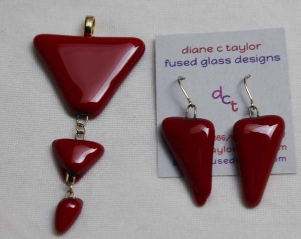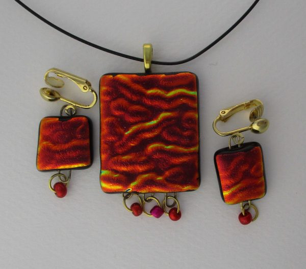 - Red/gold dichroic pendant and matching earrings (pierced or clips). Pendant, $50; earrings $25 (clip) or $30 on 14-carat gold-filled wires.