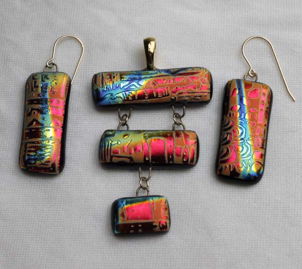 - Etched silver squares dichroic on dark red pendant, red magnetic neck wire, $40; earrings on sterling wire, $25.