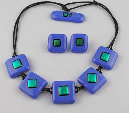 - 5-piece necklace, blue glass with green dichroic center, $80. Matching earrings (surgical steel posts), $25.