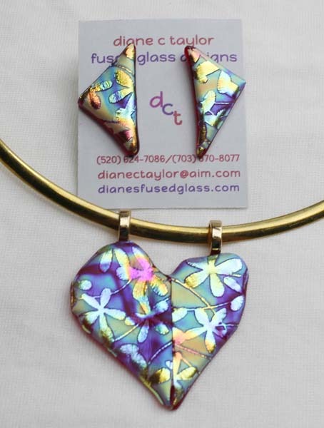 - Dichroic Flowers Heart ($70) on gold-colored neck wire with matching earrings on 14-carat gold-filled wire ($30)