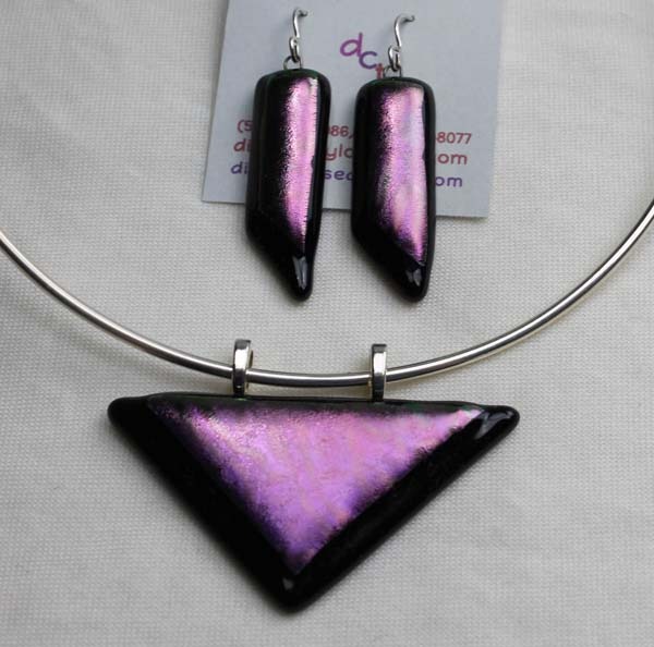 - Etched magenta tree dichroic pendant $40, earrings on sterling silver wire, $25.