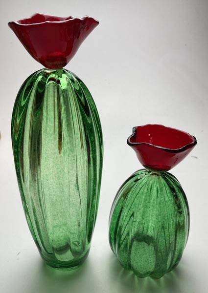 - Blown cacti, clear, sandblasted and colored with oil paint, topped with a fused flower.
